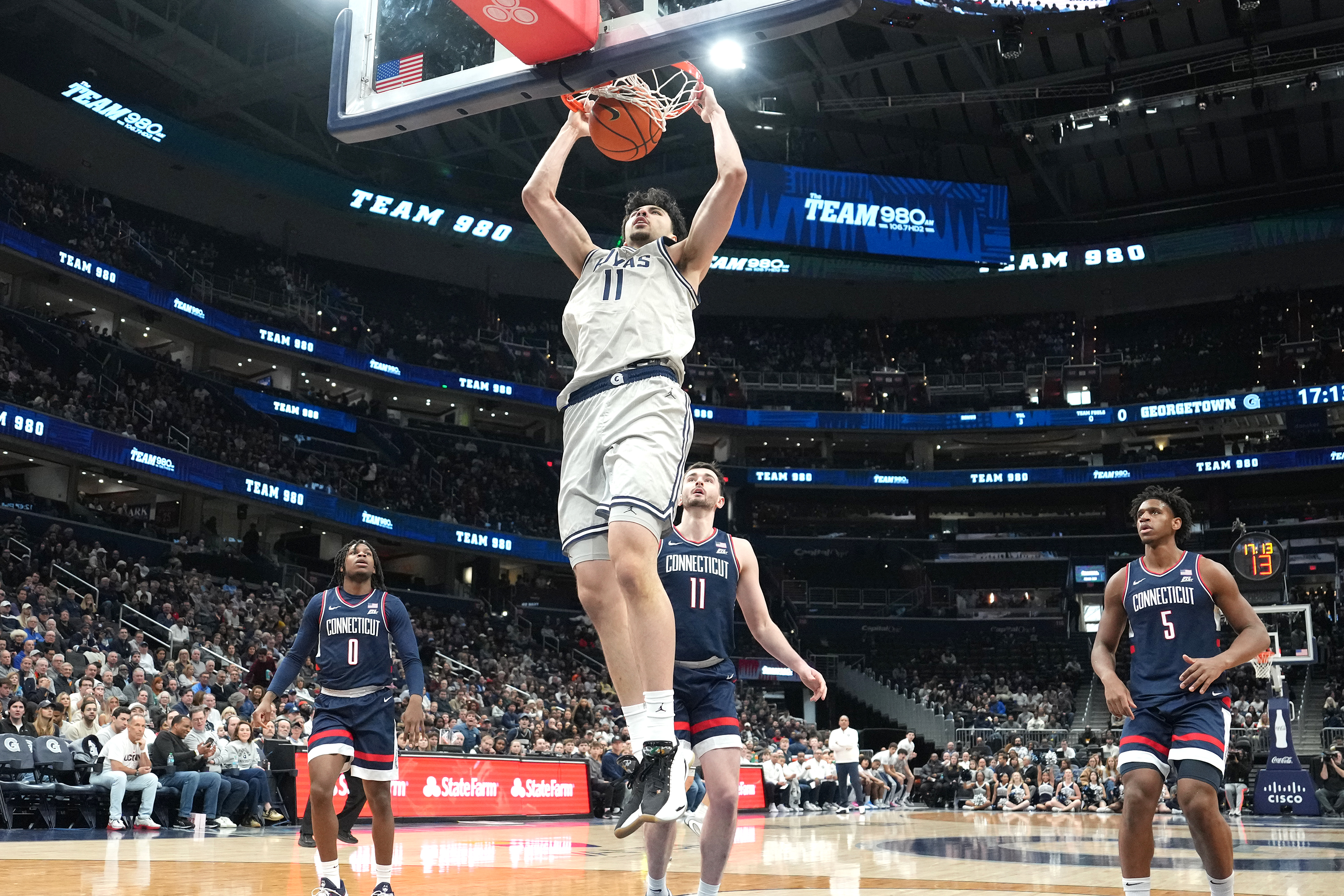 WASHINGTON, DC- JANUARY 17: Julius Halaifonua #11 of the Georgetown Hoyas dunks the ball in the fist half during a college basketball game against the Connecticut Huskies at the Capital One Arena on January 17, 2026 in Washington, DC. (Photo by Mitchell Layton/Getty Images) | Getty Images