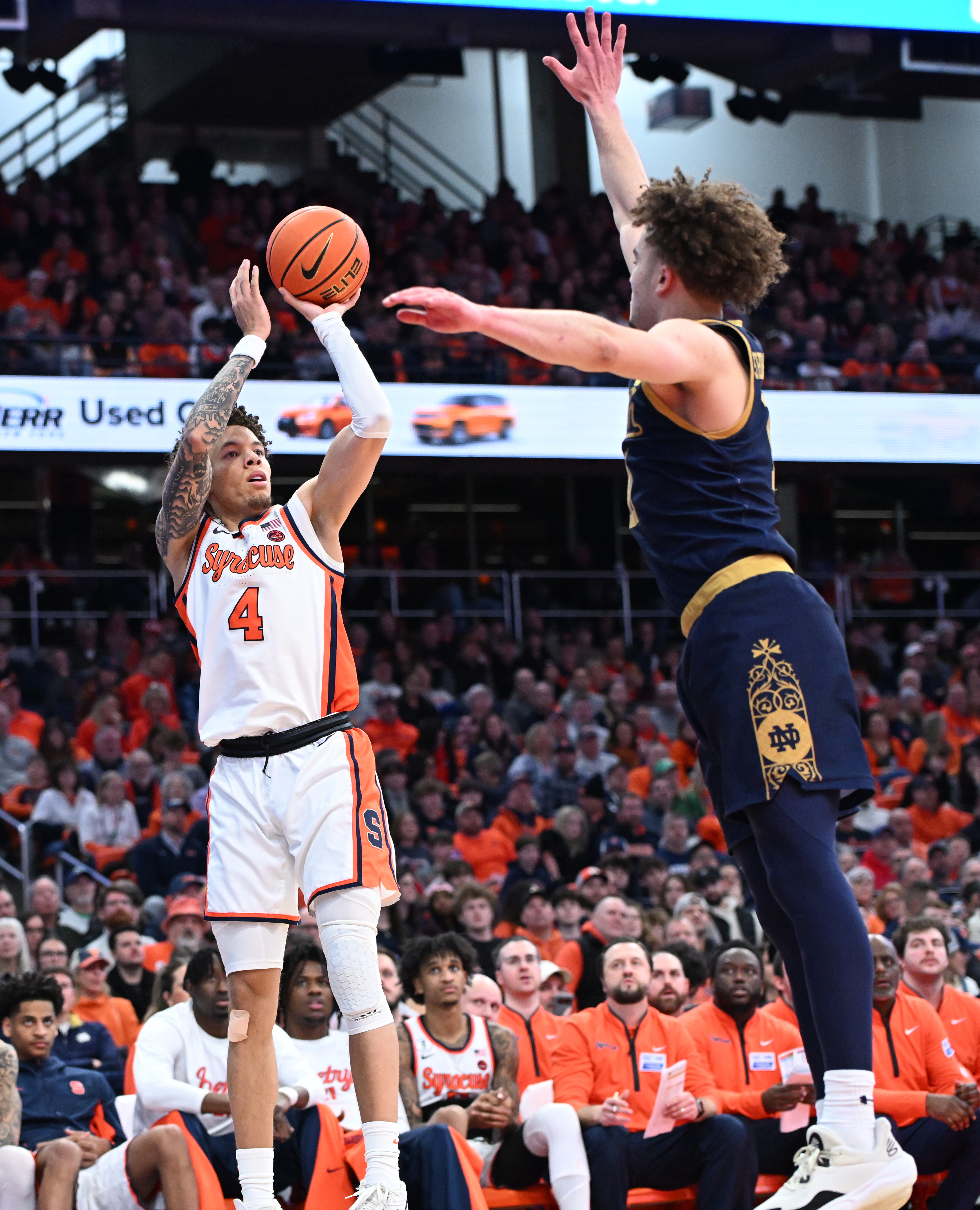 Syracuse has gotten flamethrower performances out of Kingz (5-6 against Boston College, 5-10 against Notre Dame) and Tyler Betsey (6-8 against Florida State) during ACC play, and the two are a combined 40-84 from beyond the arc in the league. The pair needed 38 more three-point attempts in non-conference play to reach that same number of made triples.