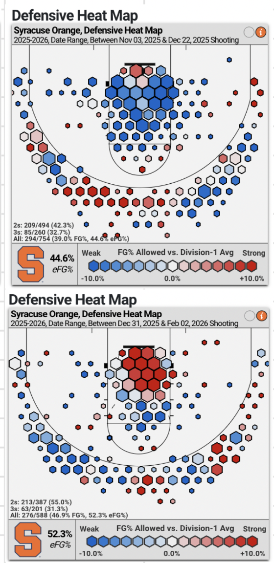 The team’s defensive rim and three rate (percentage of shots that are taken either at the rim or from three) is still one of the top marks in the sport. The Orange are still forcing a lot of mid-range shots and non-rim paint shots, but like the rim attempts, the non-rim paint shots have been going in much more, rising from 30 to 44%.