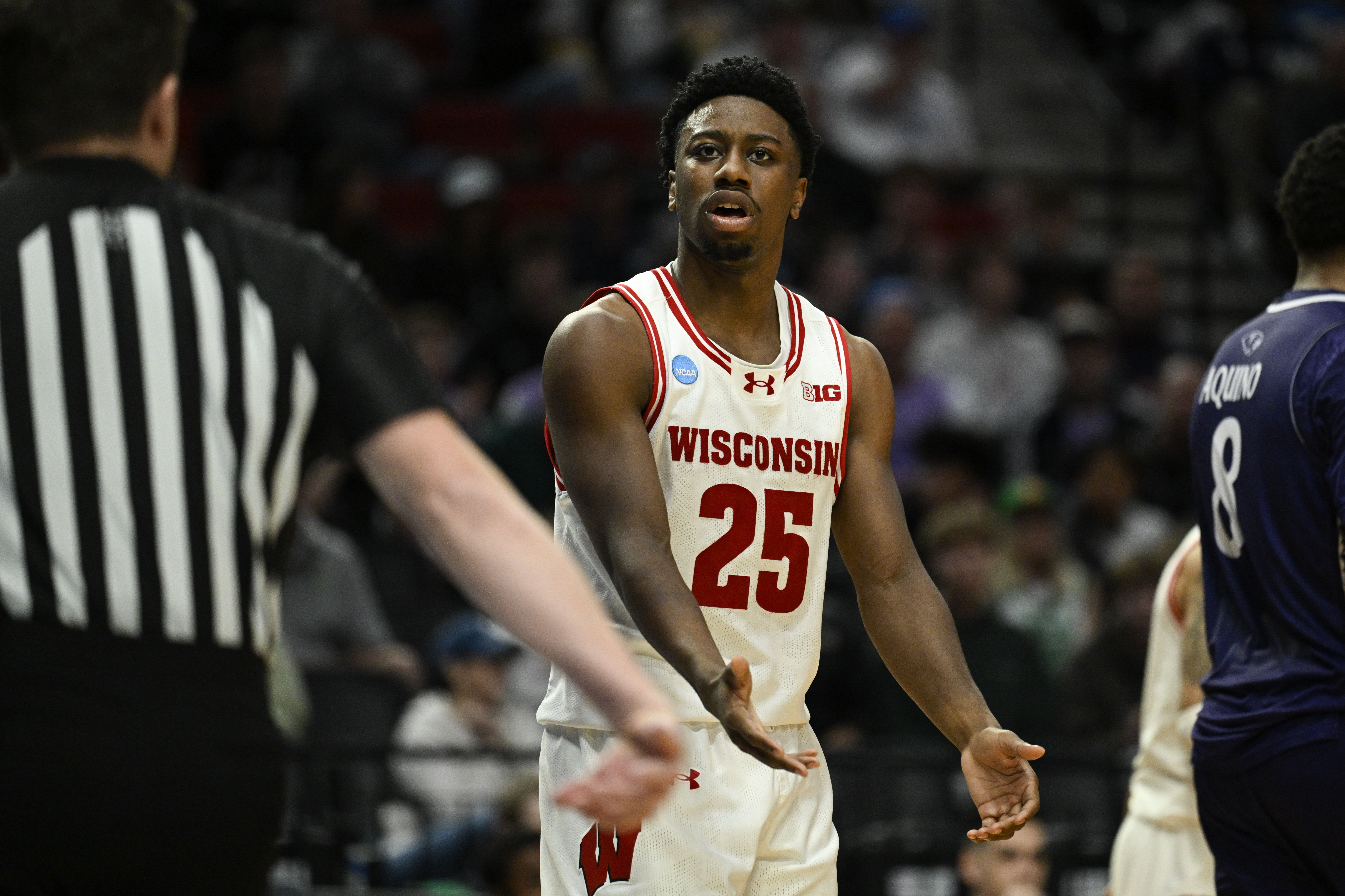 Mar 19, 2026; Portland, OR, USA; Wisconsin Badgers guard John Blackwell (25) reacts during the second half of a first round game of the men's 2026 NCAA Tournament against the High Point Panthers at Moda Center. Mandatory Credit: Troy Wayrynen-Imagn Images | Troy Wayrynen-Imagn Images